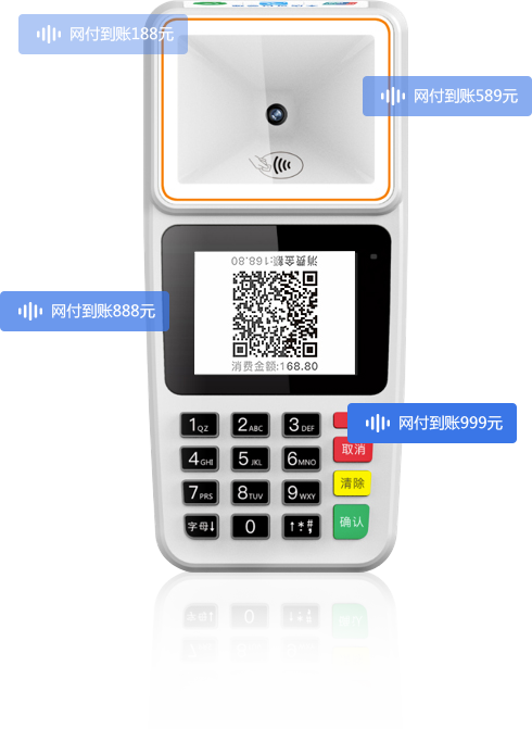 无需连接电脑,可独立使用,可移动操作满足到桌收款,外卖服 务等忙碌场景,可支持主扫、被扫等多种方式,可支持支付宝、 微信支付、花呗、信用卡